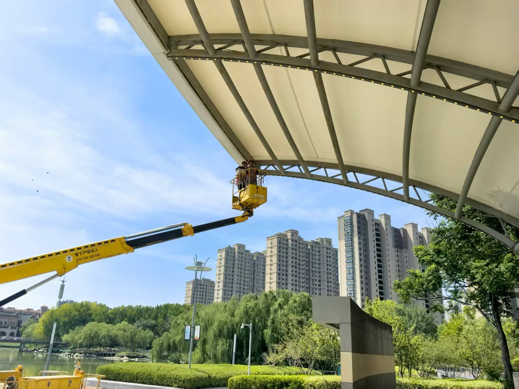 “今天在蘇州公園大舞臺進(jìn)行登高作業(yè),維修頂部燈光。注意作業(yè)平臺與頂棚保持安全距離……”8月20日上午9點(diǎn),夏日驕陽似火,蘇州公園作業(yè)現(xiàn)場氣溫已接近37℃。園區(qū)機(jī)電維護(hù)項目部技術(shù)負(fù)責(zé)人沈剛強(qiáng)和同事們開始了當(dāng)天的第一場高空維修。