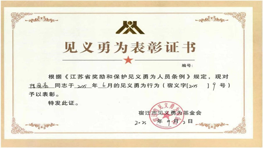 近日,園區蘇州公園工作人員陳國亮榮獲宿遷市見義勇為基金會“見義勇為”表彰。