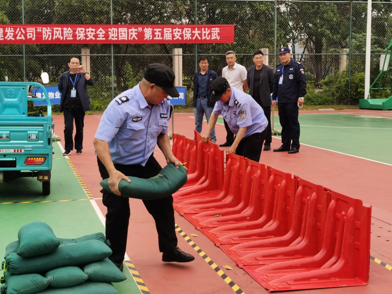 為進(jìn)一步提升公司安保人員業(yè)務(wù)素質(zhì)和服務(wù)水平,展現(xiàn)安保隊(duì)伍良好形象,提高團(tuán)隊(duì)凝聚力和戰(zhàn)斗力,9月23日上午,建發(fā)公司在園區(qū)公舍舉辦第五屆“防風(fēng)險 保安全 迎國慶”安保大比武活動。城發(fā)公司董事長、建發(fā)公司執(zhí)行董事陳非出席本次活動。