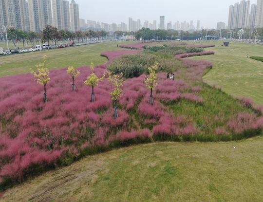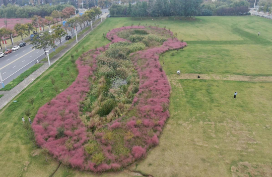 在中央商區,成片的粉黛亂子草正值最佳觀賞期,云霧般的粉色花穗在陽光下輕盈搖曳,已成為市民爭相打卡的“網紅”景點。“粉黛亂子草觀賞性雖高,養護卻需格外精心。”建發公司相關負責人介紹,為維持其最佳觀賞狀態,園區采取了分區、分時的精細化養護策略。盛花期期間,養護人員會精準控制澆水量,避免過多水分影響花穗形態;雨季則及時排水,嚴防積水導致爛根。同時,還安排了專人全天巡視,引導游客在指定區域文明觀賞,并對局部受損區域實施“點對點”修復,確保每一株粉黛都能以最美姿態,展現秋天的溫柔與浪漫。