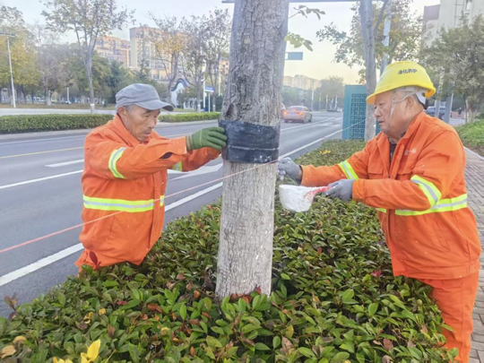 隨著氣溫逐步降低,建發公司全面啟動樹木涂白工作,為道路、公園、廣場及景觀帶的喬灌木穿上抗凍防寒、抵御病蟲害的“防護衣”,以保障其安全越冬,提高保存率,進一步擦亮城市生態底色。